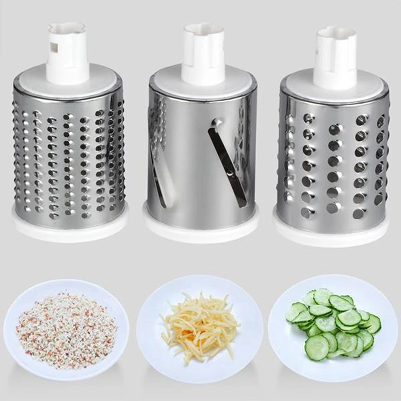 This round drum slicer has 3 easily interchangeable drum blades for different cooking choice, including fine, coarse grating/shredding, and slicing.